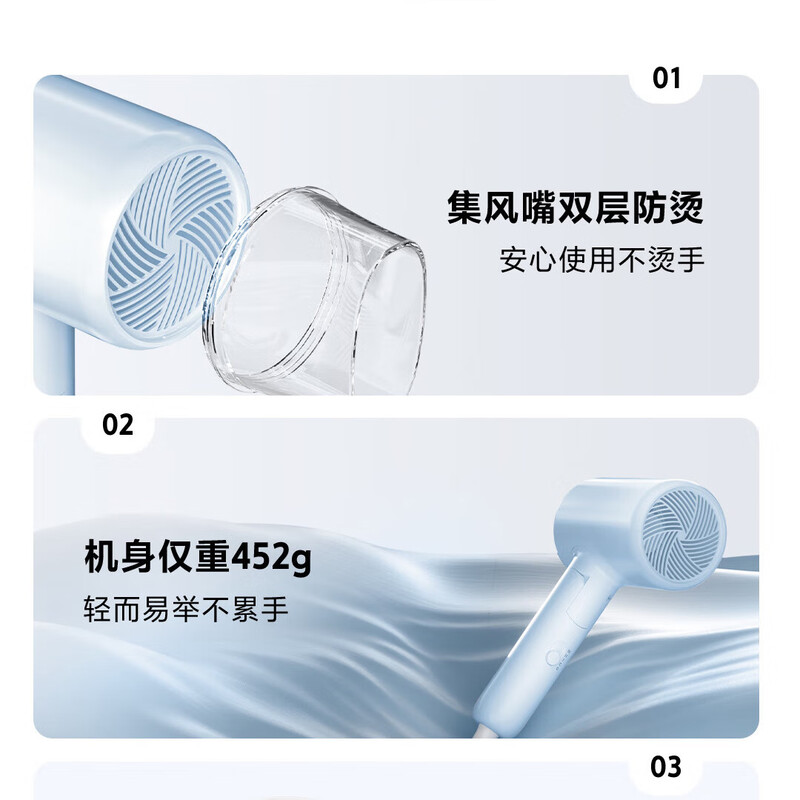 • 负离子顺滑吹护,8千万负离子中和静电,秀发一梳到底 • 集风嘴:易拆卸,轻松造型 • 折叠便携:折叠设计,轻松收纳,外出便携